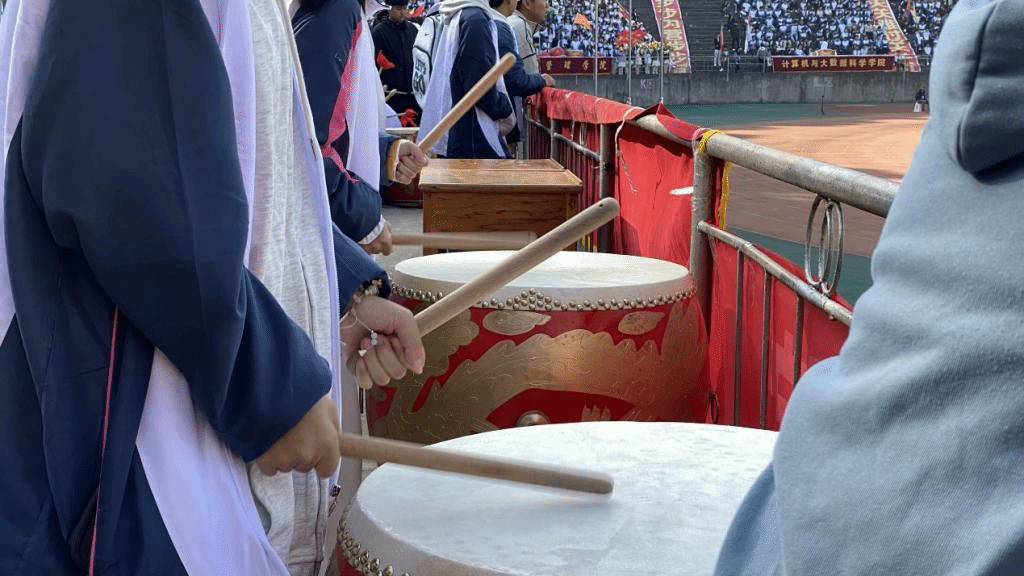“咚!咚!咚——”鼓手们的每一次卖力敲击,都将整个运动会的氛围推向高点,每一击都富有节奏和韵律,饱含力量与激情。文学院A2461班的鼓手张伦昱说道:“我认为鼓手在振奋选手和观众的精神方面有着很大的作用,所以我想要为此出一份力。看到台下运动员拼尽全力争取名次时,我被他们的体育精神深深感染,既然他们在用尽全力的比赛,那我也要百分百的热情把鼓敲好、把鼓敲响!”