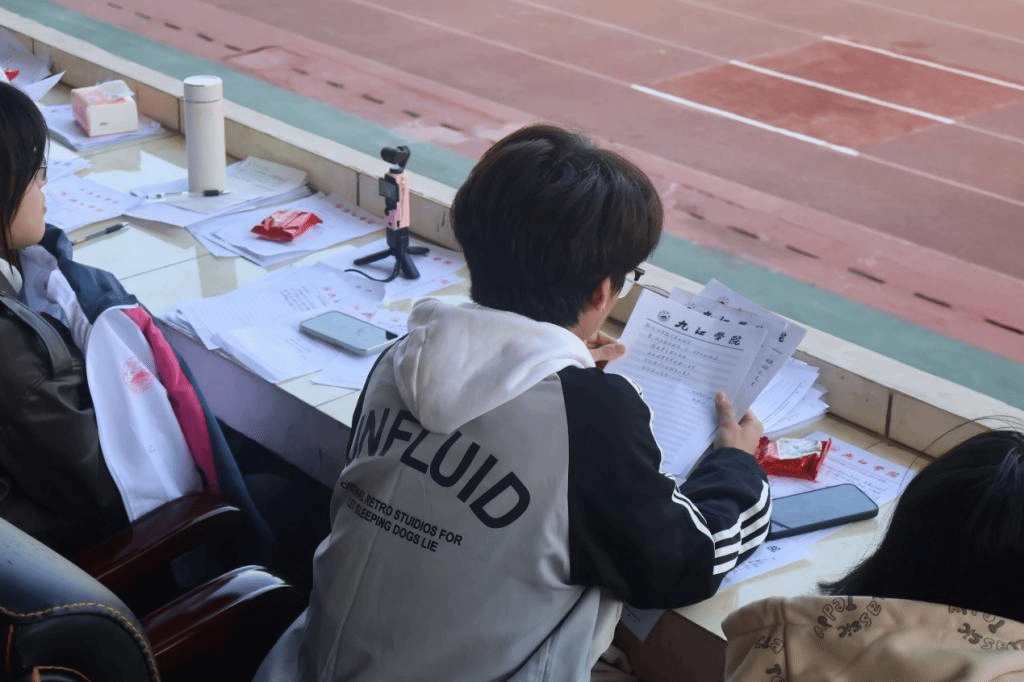 “请第三组的运动员们到检录处进行检录……”在激情与活力之外,裁判组无疑是维持赛场秩序、确保比赛公平公正的中坚力量。助理裁判员们穿着统一的制服,脸上洋溢着专业而严肃的神情,为即将到来的每一项比赛做好充足的准备。“我们的工作主要是辅助裁判老师,维持比赛秩序。非常荣幸能够在这个岗位,在锻炼自己的同时又可以为大家服务。”体育学院A2321班助理裁判员李梦涵说道。