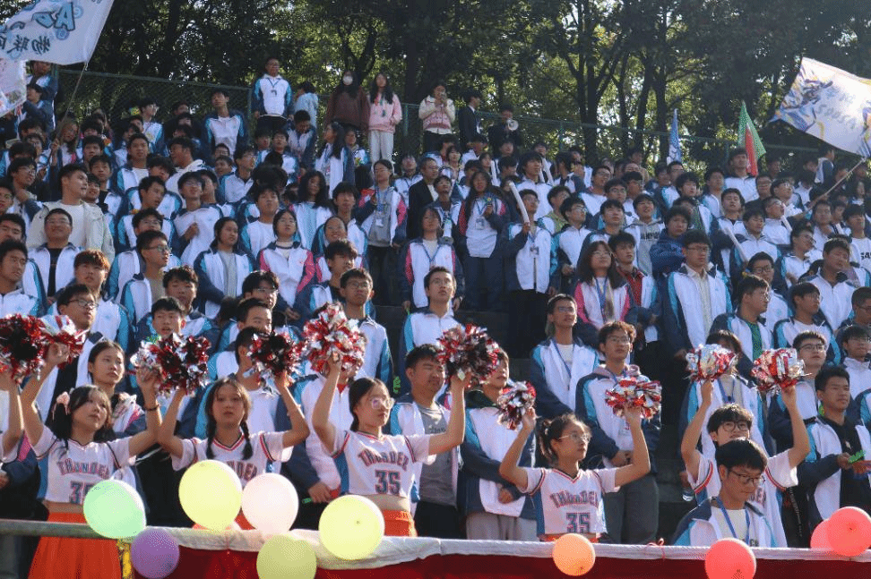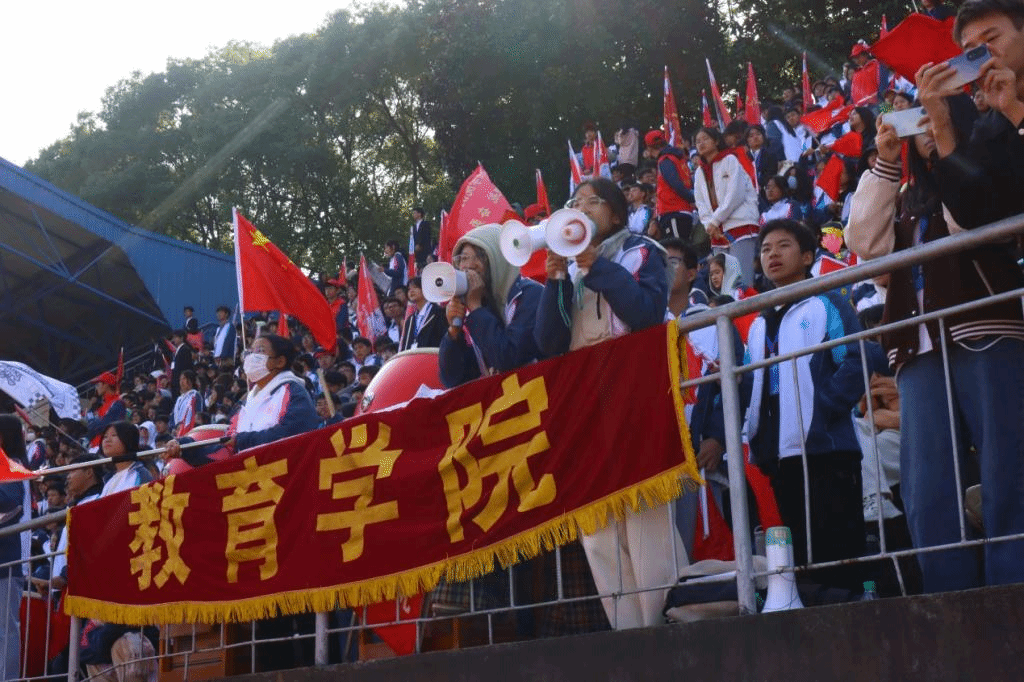 拉拉队员们身着统一的服饰,用歌声和舞蹈为运动员们加油鼓劲。各个学院也为观众们准备了具有学院特色的加油道具、彩旗、手拍等,同学们卖力地挥动手中的手拍,为运动员们加油喝彩,摇旗呐喊。