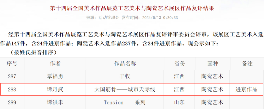 日前,第十四届全国美术作品展览进京作品展在中国美术馆和中国国家博物馆进行。在各展区的作品复评结果中,贝博官网艺术学院谭丹武老师的陶艺作品《大国筋骨-城市天际线》成功入选,并被选为进京作品,这也是九江市在第十四届全国美展上唯一入选的进京作品。同时,艺术学院教师张甘霖的艺术作品《竹影印记》也入选本届全国美展壁画展区作品展。