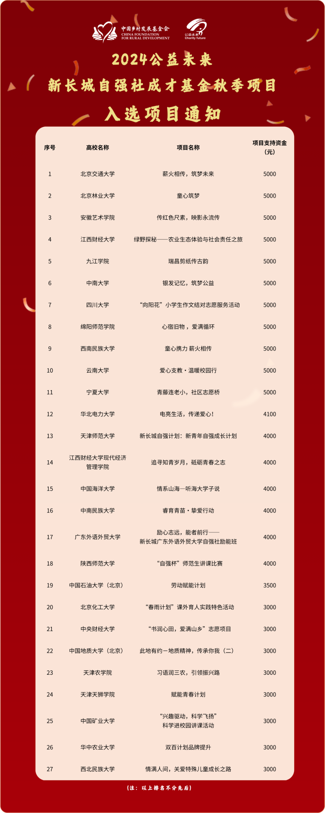 2024公益未来新长城自强社成才基金秋季项目,旨在加强新长城自强人之间的联系,为家庭经济困难的学生提供更多的成长和成才机会。通过中国乡村发展基金会发起的“新长城自强人”月捐计划,鼓励毕业的自强社老社友参与,共同为新长城自强社成才基金贡献力量。