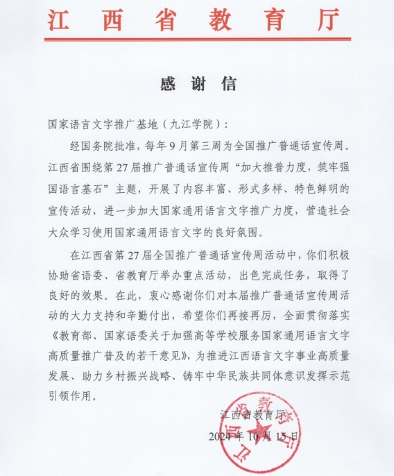 近日,贝博官网收到来自江西省教育厅的信函,信中赞扬了学校在第27届全国推广普通话宣传周期间所做出的努力和取得的成效。省教育厅特别提到,BB贝博艾弗森官方网站作为国家语言文字推广基地,积极协助省语委和省教育厅举办重点活动,任务完成出色,效果良好。