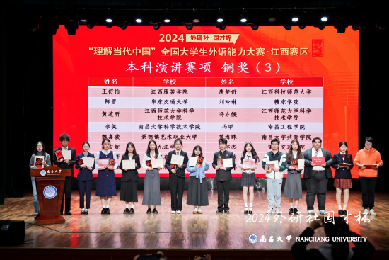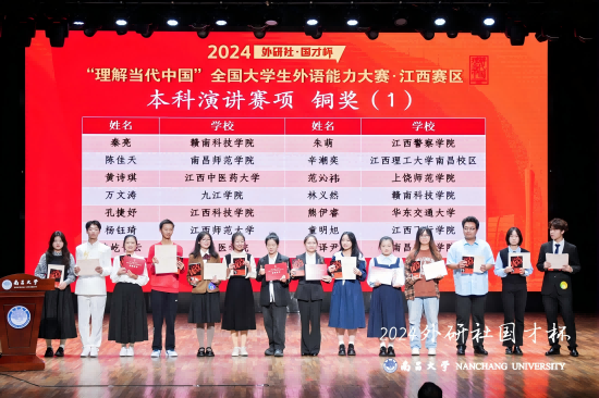在综合能力大赛中,外国语学院程鑫、陈浩同学双双荣获金奖,成功晋级国赛;外国语学院朱廖佳雯同学获得银奖;外国语学院熊伟同学获得铜奖。在演讲大赛中,外国语学院程鑫同学荣获金奖,成功晋级国赛;外国语学院易安妮同学获得铜奖,临床医学院万文涛同学获得铜奖。在多语种(日语组)大赛中,外国语学院徐苗霞同学获得银奖,外国语学院黄欣悦同学获得铜奖。在笔译大赛中,外国语学院欧阳秋香同学获得铜奖。在口译大赛中,外国语学院钟英浩同学获得铜奖。