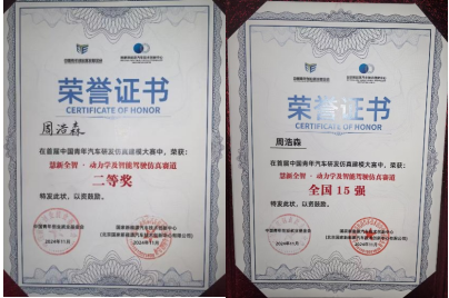 11月9日-10日,由中国青年创业就业基金会、国家新能源汽车技术创新中心共同主办的首届中国青年汽车研发仿真建模大赛分赛道决赛在北京经开区成功举办,药学与生命科学学院A2413班的周浩森同学以出色的表现荣获全国15强和全国二等奖的佳绩。