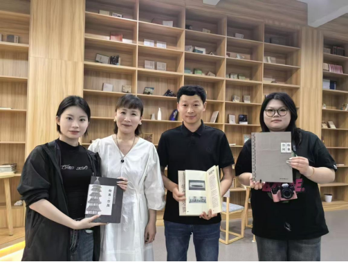 此次分享的手工图书中有三本为谭丹武老师的艺术设计作品集制作的图书,呈现了三种不同的表现,还有为刘书樵女士的《九江味道》及诗配画作品《一边是生活,一边是爱情》设计的书籍。两位作者对同学们的设计大为赞赏,兴奋地和设计者合影留念,并计划出版图书。