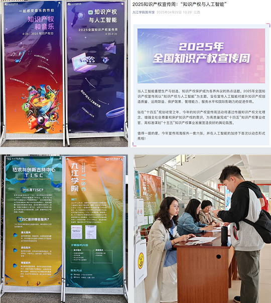 为迎接第25个世界知识产权日及全国知识产权宣传周,在九江市市场监督管理局(知识产权局)的指导下,学校知识产权信息服务中心(挂靠图书馆)精心策划并开展了一系列形式多样、内容丰富的宣传活动,通过线上线下联动、师生共同参与,在校园内掀起“尊重知识、崇尚创新”的热潮,进一步强化了知识产权保护意识。