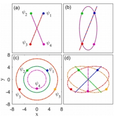 1.研究具有离轴和啁啾参数的厄米高斯孤子,在抛物势阱中的传输特性。根据啁啾参数的不同,可以呈现三种不同的传播状态(包括蛇形、椭圆和圆螺旋轨迹)。几个厄米孤子可以组成孤子阵列,并能呈现不同传输变化。