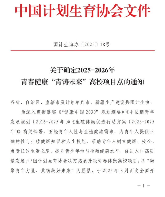 近日,中国计划生育协会正式公布了2025-2026年青春健康“青铸未来”高校项目点名单。贝博官网校医院申报的“青春健康,铸享未来”项目从全国600余所高校中脱颖而出,成功入选。这是贝博官网继2023年成功获批并顺利结项中国计生协高校项目后,再次获批项目点,标志着贝博官网青春健康教育工作得到持续认可。