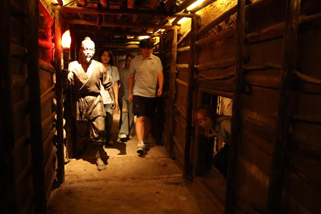 踏入瑞昌铜岭铜矿考古遗址公园,实践队员们仿佛穿越时空隧道,置身于殷商先民的智慧世界。在专业讲解员的引领下,昏暗的仿真巷道重现 “竖井下掘”、“木架支护” 的古老技艺——斑驳的巷道壁上,清晰可见石锤凿刻的痕迹;陶制排水管道蜿蜒盘曲,诉说着先民应对地下开采难题的巧思;原始炼炉遗迹虽已沉寂千年,却依然能让人感受到当年火光冲天、铜液奔涌的壮观场景。