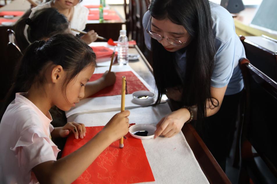 实践队员们不仅是矿冶文化的探寻者,更是新时代文明的传播者与乡村振兴的践行者。他们走进当地实践点,化身传统文化导师,从书法基础笔画教学到特色 “福” 字书写,从漆扇绘制到历史故事分享,让孩子们在趣味互动中感受中华优秀传统文化的魅力,实践队还向实践点赠送了书法作品;他们走上街头巷尾,变身反诈宣传员,通过典型案例剖析、反诈知识宣讲和资料发放,切实提升群众防范电信诈骗的意识和能力。