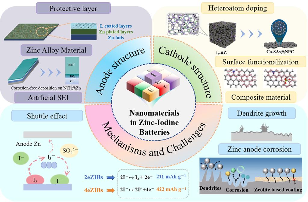水系锌碘电池(AZIB)因其低成本、高安全性、多种电子转移特性以及锌金属的高理论容量(820 mAh g−1)而成为新型储能系统的重要候选者。然而,AZIB的实际应用仍然面临重大挑战,主要包括碘的缓慢氧化还原动力学和多碘化物的穿梭效应。穿梭效应不仅会降低正极活性物质的含量,还会穿梭至负极与锌负极发生剧烈的自放电反应,导致锌负极腐蚀以及表面钝化等副反应。为了抑制穿梭效应,主要研究方向是寻找具有强碘和多碘化物吸附性能的正极基质材料,因此本文重点关注纳米材料的相关研究。本文旨在概述不同的储能机制以及AZIB面临的各种挑战。然后,讨论了抑制碘物质穿梭效应的各种策略,包括正极材料设计、负极保护和电解液调节。最后,本文对纳米材料在AZIB领域的未来研究前景进行了展望,旨在为理解AZIB的发展现状提供新的思路,为高性能AZIB的实现提供有价值的指导,促进AZIB的进一步发展。(原文链接:https://pubs.acs.org/doi/10.1021/acsnano.5c06585)