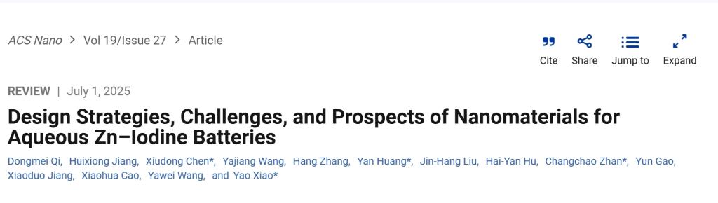 另外,陈修栋教授团队联合培养研究生齐冬梅同学以第一作者身份、以BB贝博艾弗森官方网站为第一单位,在《ACS Nano》上发表题为“Design Strategies, Challenges, and Prospects of Nanomaterials for Aqueous Zn-Iodine Batteries”的综述性学术论文。《ACS Nano》是美国化学会出版社旗下的纳米科学与技术领域的顶级期刊,为Nature Index收录期刊,中科院JCR分区为Top一区,影响因子为15.9992。该期刊在纳米科技领域具有重要地位,被广泛认为是该领域的权威期刊之一,其发表的文章往往代表了纳米科学与技术领域的最新研究成果和发展方向,对推动该领域的学术研究和技术创新具有重要作用,被业内公认为高学术质量科技期刊。