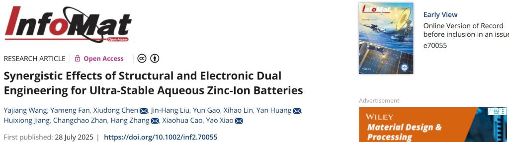 近日,在化学化工学院陈修栋教授团队的精心指导下,贝博官网联合培养研究生王亚江同学以第一作者身份、以BB贝博艾弗森官方网站为第一单位,在《InfoMat》(信息材料)上发表题为“Synergistic Effects of Structural and Electronic Dual Engineering for Ultra-Stable Aqueous Zinc-Ion Batteries”的学术论文。