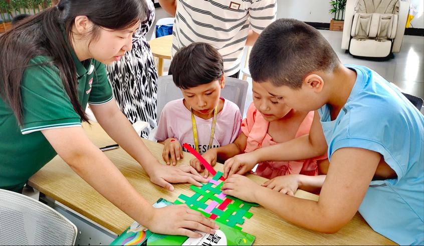 课堂上的“你画我猜”环节更是热闹非凡。队员们画出“葡萄”等新疆特色事物,孩子们抢着用国家通用语言喊出答案,偶尔发音不准时,队员们便顺势纠正声调,笑声里藏着最生动的教学。“以前觉得念课文难,现在编竹篾、猜图画时,不知不觉就会说了!”小朋友热依拉举着自己编的“竹编”,眼里闪着光。红领巾课堂以趣味为媒,让国家通用语言成为孩子们认识世界的“魔法棒”,更让中华优秀传统文化在指尖与舌尖悄然传承。