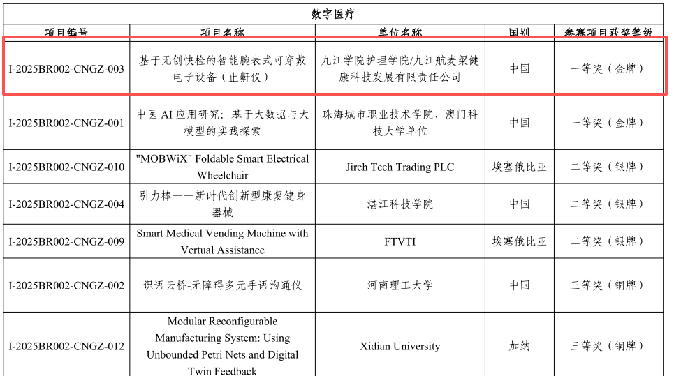 8月24日下午,第十一届国际发明展览会暨“一带一路”金砖国家技能发展与技术创新大赛在广州圆满落幕。贝博官网护理学院袁荣华老师带领学生团队研发的科创项目“基于无创快检的智能腕表式可穿戴电子设备(止鼾仪)A smartwatch-style wearable electronic device (anti-snoring device) based on non-invasive rapid testing”在众多参赛队伍中脱颖而出,在数字医疗赛道中勇夺第一名,首次摘得本届大赛国际发明展览金奖。