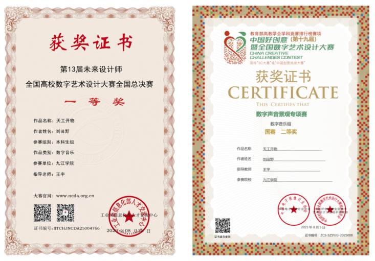 2025年对刘田野而言是丰收年。八月,在艺术学院教师王宇的指导下,其原创作品《天工开物》连获两项国赛大奖,尽显扎实原创能力。此次受邀为经典曲目编创并登上央视,又彰显了他在音乐改编与二度创作领域的潜力。