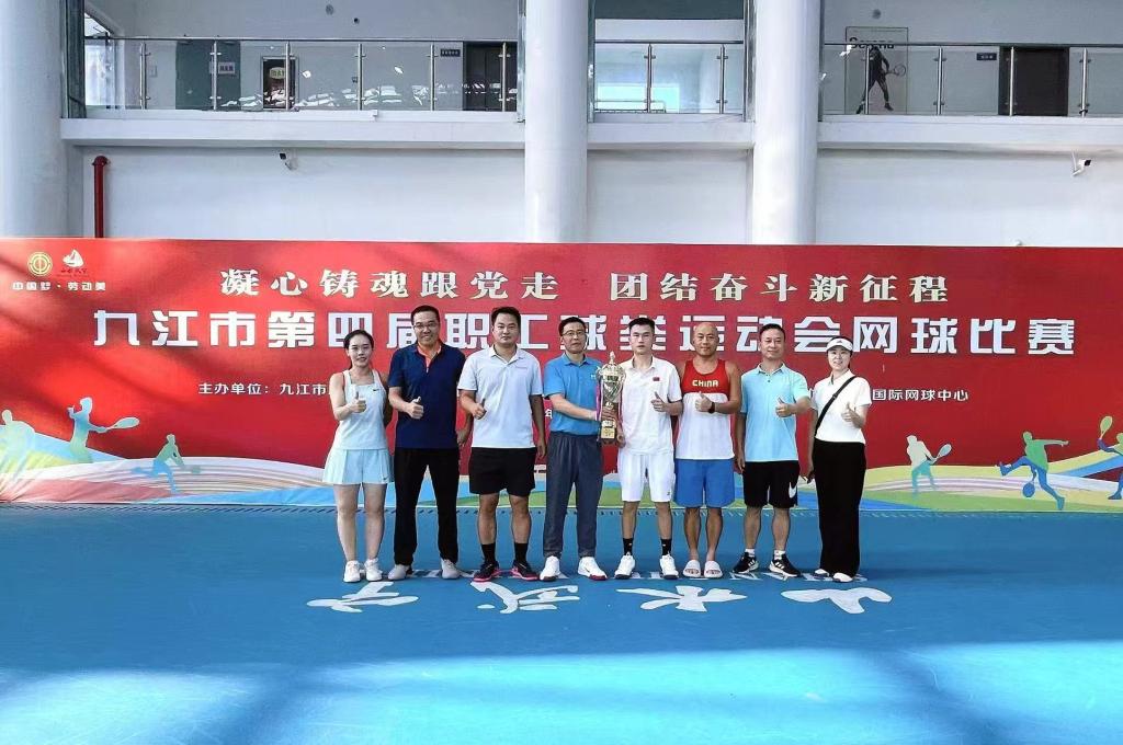 本次赛事由九江市总工会主办、武宁县总工会承办,来自九江市直机关的13支队伍和区县代表队11支队伍、200多名运动员同场竞技,竞争强度与参赛水准均创历年新高。作为卫冕冠军,贝博官网网球队自小组赛便展现出超强实力,以未失一盘的完美表现晋级决赛。决赛中,队员们顶住对手的强力冲击,凭借精准的发球、灵活的底线对抗与默契的网前配合,最后大比分获胜、赢得冠军。
