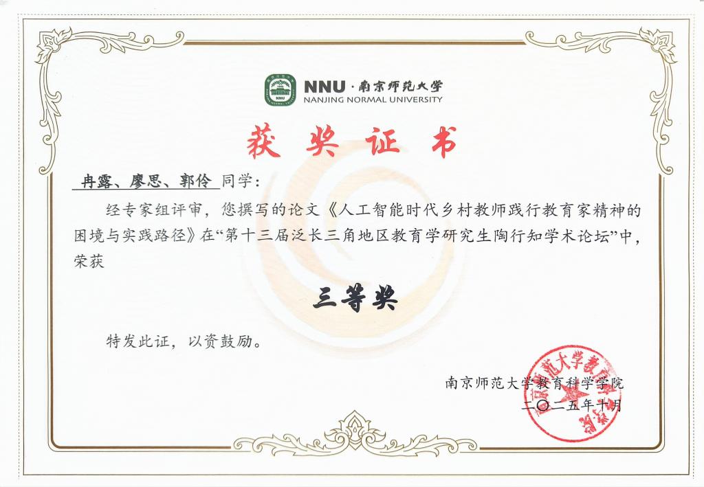 近日,第十三届泛长三角地区教育学研究生陶行知学术论坛获奖名单公布,教育学院“口述史”采集与整理研究团队冉露、廖思、郭伶三位同学的论文《人工智能时代乡村教师践行教育家精神的困境与实践路径》在强毅老师的指导下荣获三等奖。在本届以研究生为主的学术论坛中,他们三位是获奖者中为数不多的本科生,这一成绩充分展现了学校在人才培养方面的扎实基础与突出成效。