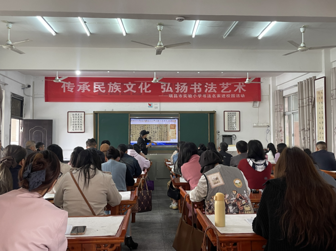 另一场报告特邀九江市青年书法专家严耀喜主讲,主题为《教师的书法审美与提高》。严老师以《兰亭序》《颜勤礼碑》等经典碑帖为范本,分析古代书法名作的笔法、结体和章法,深入解析书法艺术的审美内涵。这场讲座既有理论阐述,又能够从执笔姿势、篇章布局等方面进行实践指导,尤其将书法美学融入课堂板书,让教师们纷纷表示受益匪浅。