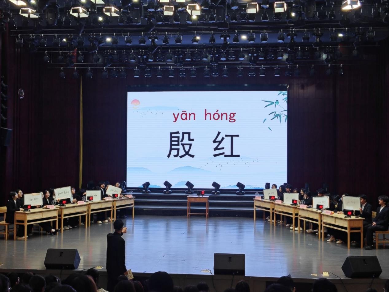 本次大赛自10月启动以来,各学院高度重视、广泛动员,累计吸引千余名学生参与。11月下旬,校级复赛通过多轮测试筛选出8支精英队伍晋级决赛。决赛设置“文韵初阶挑战”“文脉寻踪对决”“诗韵巅峰对擂”三大递进式环节,分别从汉语基础规范、传统文化内涵、诗词才情素养三个维度考查选手综合能力。其中,压轴环节“飞花令”氛围尤为热烈,选手们才思敏捷、出口成诗,围绕指定主题轮番应答,充分展现了扎实的文化功底与临场应变能力,赢得现场观众阵阵掌声。现场同步开展的互动游戏环节,同学们踊跃参与、积极竞答,进一步营造了“选手竞技展风采、观众同乐品书香”的良好氛围。