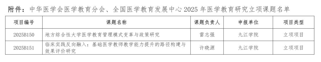近日,中华医学会医学教育分会、全国医学教育发展中心正式公布2025年度医学教育研究课题立项结果。本次课题申报共吸引全国120所医学院校及相关单位参与,申报课题870项。经专家组严格评审,最终确定立项课题424项。贝博官网共申报两项课题,均成功获得立项,在本轮评审中表现突出,取得历史性突破,这标志着贝博官网在医学教育研究方面获得国家级认可,彰显了学校在医学教育领域的持续探索与创新能力。
