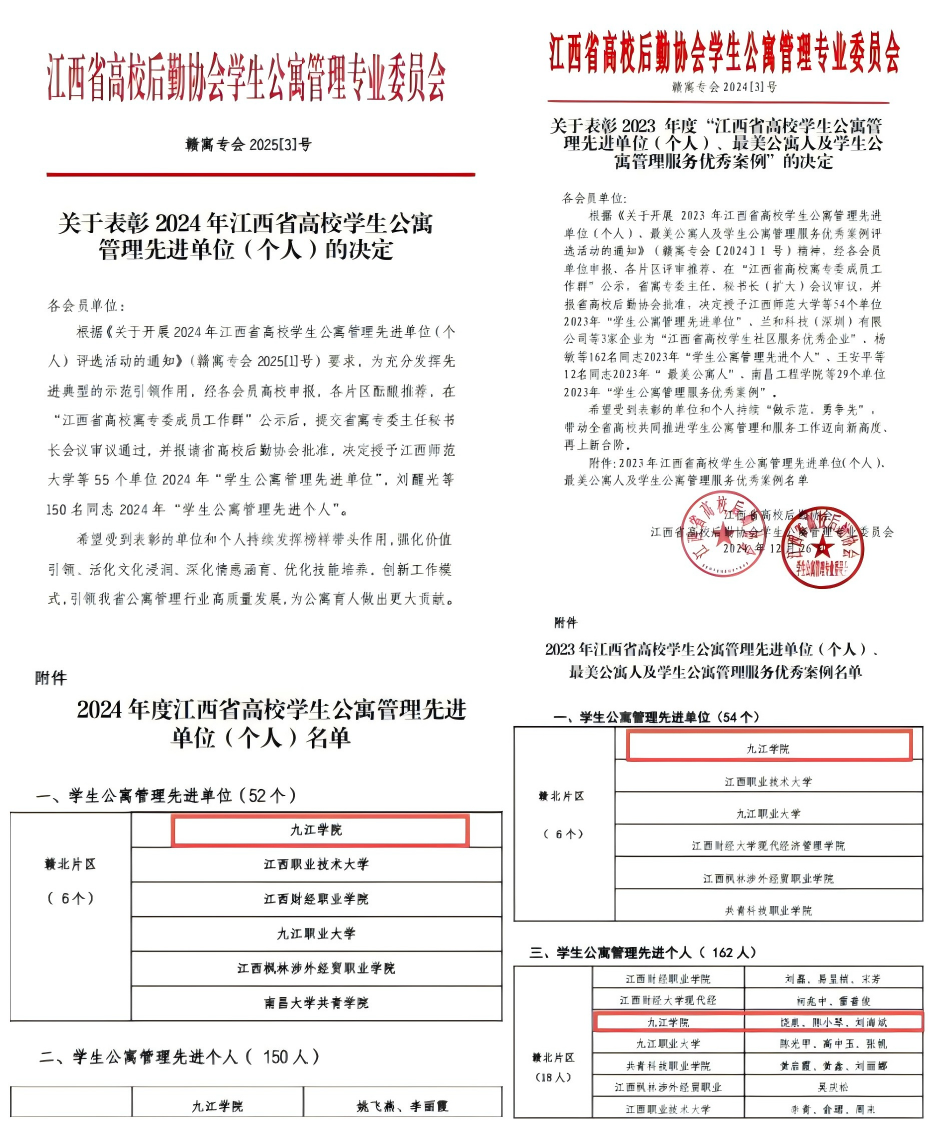 近日,江西省高校后勤协会学生公寓管理专业委员会2025年年会暨学生公寓管理规范化建设推进会在江西理工大学召开。大会表彰了2023年度及2024年度江西省高校学生公寓管理先进单位及个人。BB贝博艾弗森官方网站荣获2023、2024年度“江西省高校学生公寓管理先进单位”称号,饶泉、陈小琴、刘海斌、姚飞燕、李丽霞5位同志荣获2023、2024年度“江西省高校学生公寓管理工作先进个人”称号。