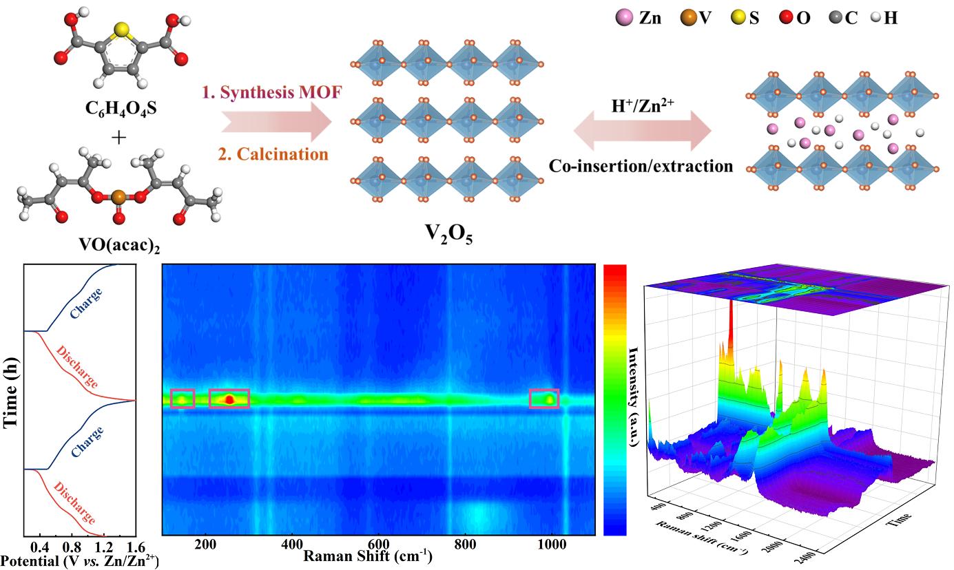 此外,团队在《Journal of Energy Storage》(中科院2区期刊,影响因子9.8003)发表了题为“Hierarchical V2O5Cathode Derived from π-Conjugated Thiophene Metal-Organic Framework Enabling Ultra-Stable and High-Rate Aqueous Zinc-Ion Storage”的研究论文。论文报道了一种π-共轭噻吩基MOF衍生的分级结构V2O5正极(ThAC-V2O5)。通过优化前驱体设计与热解工艺,形成的多孔结构加速离子/电子传输,在0.2 A g⁻¹下实现419.1 mAh g⁻¹的高容量,且在10 A g⁻¹的超高电流密度下循环6000圈容量保持率达80.0%。该材料组装的柔性电池在多角度弯曲下仍保持稳定电化学性能,为便携式电子设备供电提供了新方案。