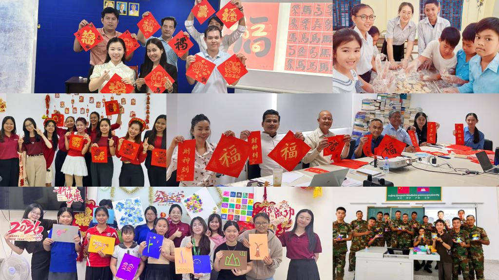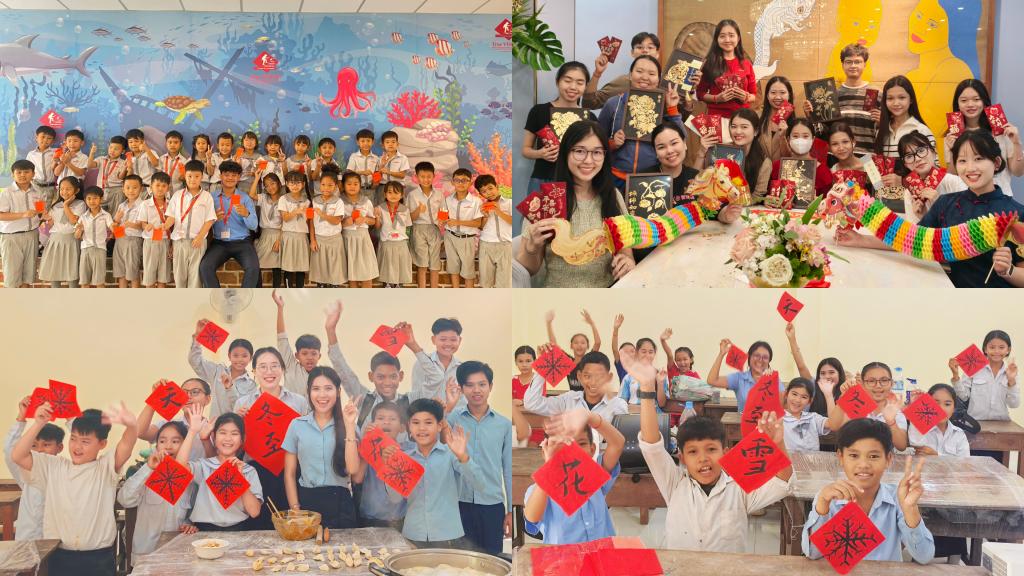 监察部汉语中心老师带领学生围绕春节策划开展系列庆祝活动,通过青花瓷拼贴画、金箔画制作、中柬歌曲演唱、书法书写及趣味互动游戏等多种形式,引导学员体验春节文化、传递新春祝福。