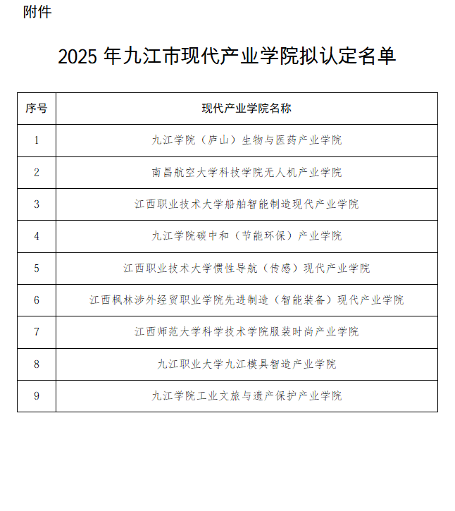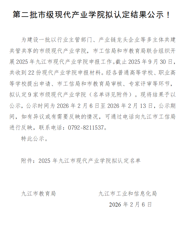 近日,九江市工信局、九江市教育局联合公示2025年九江市第二批市级现代产业学院拟认定结果,贝博官网申报的BB贝博艾弗森官方网站(庐山)生物与医药产业学院、BB贝博艾弗森官方网站碳中和(节能环保)产业学院、BB贝博艾弗森官方网站工业文旅与遗产保护产业学院等3家产业学院成功入选。