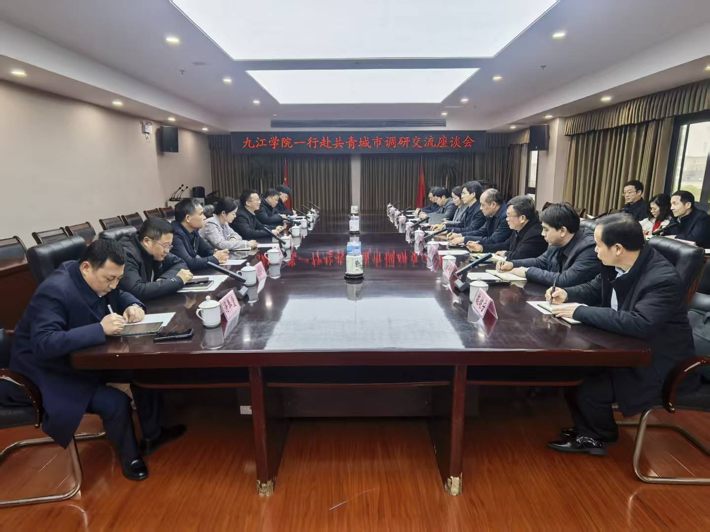 学校党政办公室、科研处(社会服务办公室)、招生与就业处、艺术学院、法学院、管理学院、材料科学与工程学院、理学院、机械与智能制造学院、外国语学院等部门负责人,共青城高新区、教体局、人社局、科技局、人才服务中心参加调研。