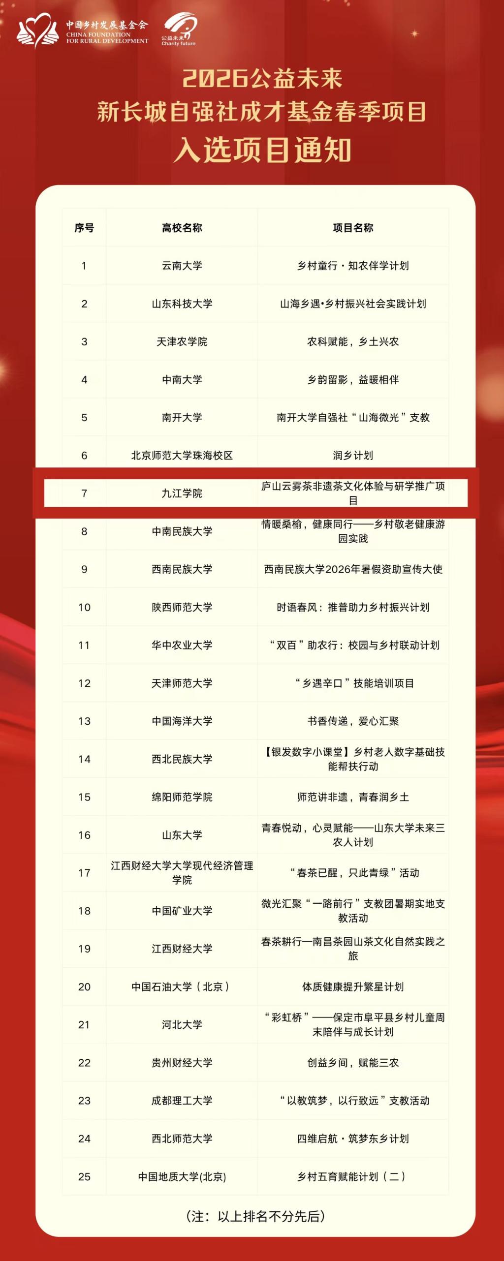 近日,2026公益未来·新长城自强社成才基金春季项目评审结果正式揭晓。由校学生工作处(学生资助管理中心)指导的新长城BB贝博艾弗森官方网站自强社申报的《庐山云雾茶非遗茶文化体验与研学推广项目》成功入选。本次春季项目原定支持16个名额,评审组结合申报项目整体质量增补9个名额,最终全国仅25个高校项目脱颖而出获得支持,贝博官网项目成功跻身其中,充分彰显了BB贝博艾弗森官方网站青年学子立足专业、赋能乡村、传承文化、勇担使命的青春风采。