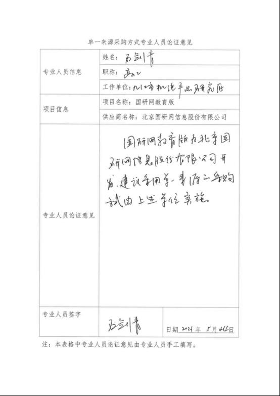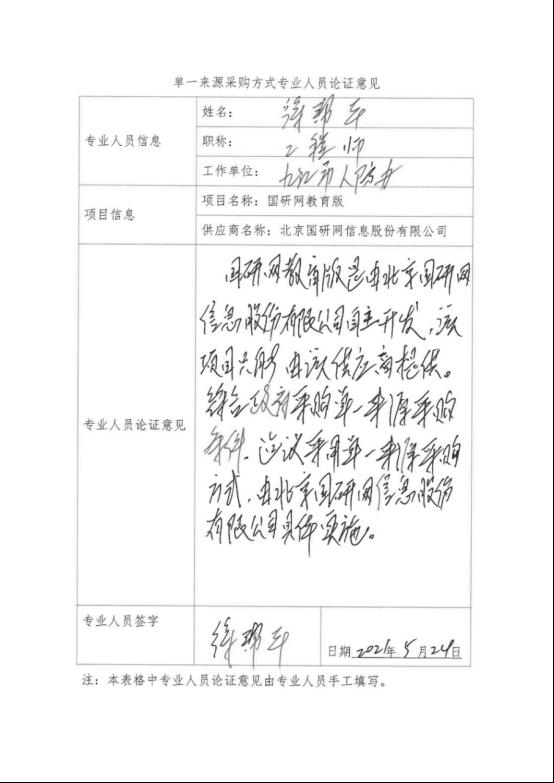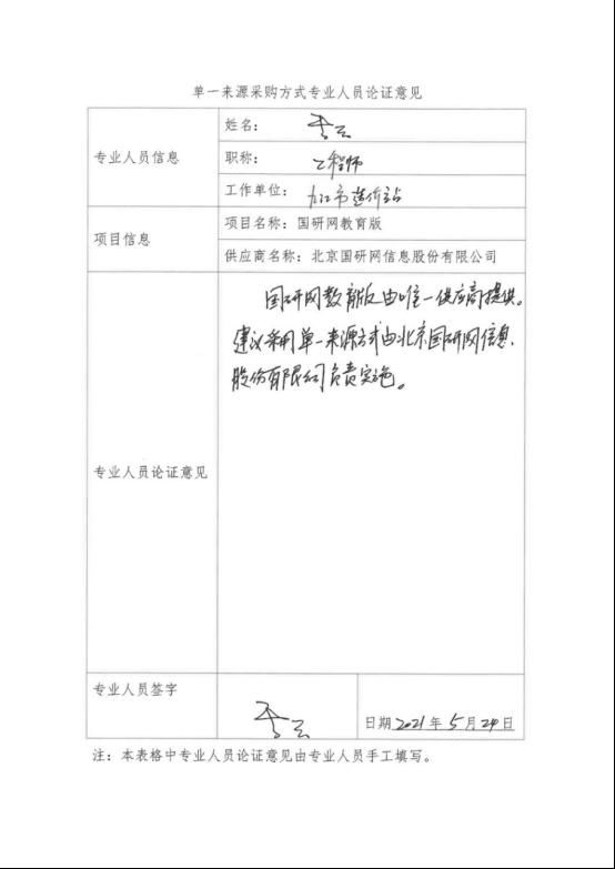 采用单一来源采购方式的原因及说明:“国研网教育版”是由北京国研网信息股份有限公司自主研发,该项目只能由北京国研网信息股份有限公司提供,符合单一来源采购条件,建议采用单一来源采购方式,由北京国研网信息股份有限公司具体实施。